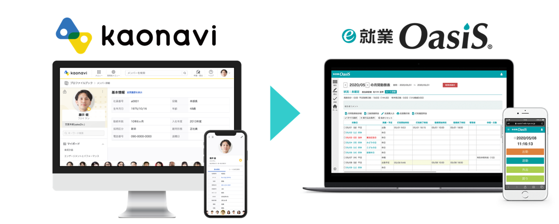 カオナビに登録されている従業員情報をe-就業OasiSに同期します。従業員情報の新規登録・更新が可能となります。勤怠管理システム側への従業員情報の登録が容易になることで人事担当者の負荷を減らし、本来の業務に集中できる環境を整えられます。