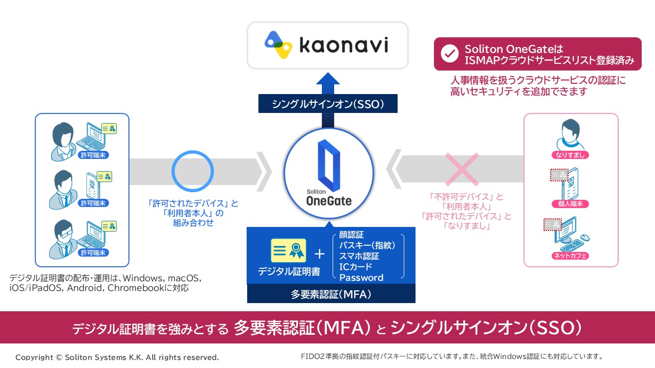 Soliton OneGateは、CA機能を標準搭載し、デジタル証明書による多要素認証(MFA)を提供するID認証サービスです。デジタル証明書は利用端末を特定でき、フィッシング攻撃や認証突破攻撃を防止する優位性があります。カオナビとのSAML連携により、人材データベースへのアクセスを信頼できる端末のみに限定し、不正アクセスを強力に防止します。さらに、Wi-Fi・VPN認証も統合管理できるため、オフィス内外を問わず、一貫した高セキュリティ環境でタレントマネジメント業務を実現します。
