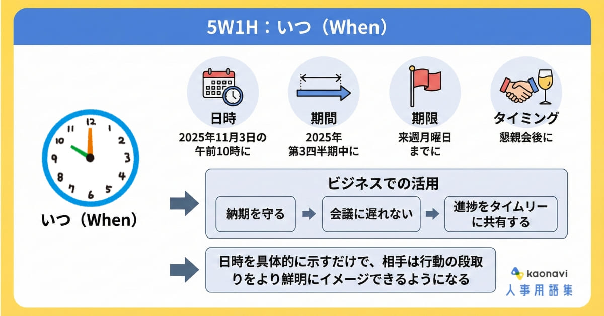 ビジネスの現場では「納期を守る」「会議に遅れない」「進捗をタイムリーに共有する」といった場面に「いつ」が関わってきます。日時を具体的に示すだけで、相手は行動の段取りをより鮮明にイメージできるようになるでしょう。