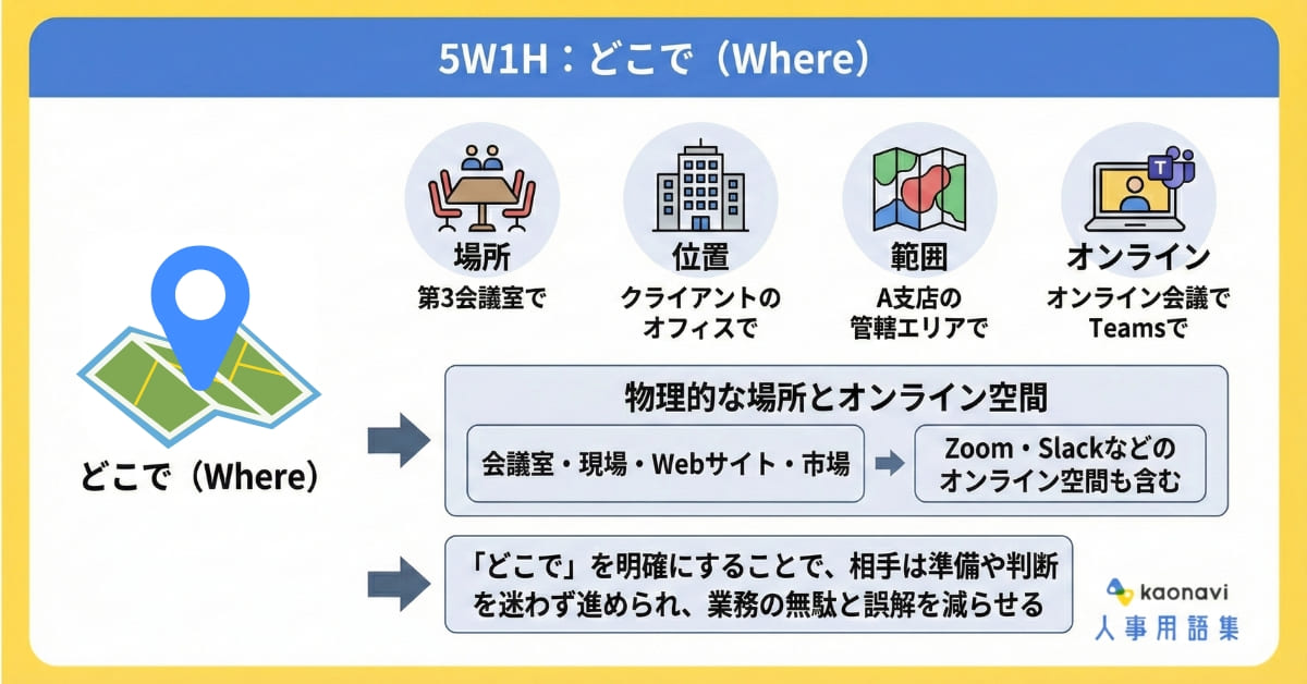 会議室や現場といった物理的な場所だけではなく、Webサイト、特定の市場、さらにはZoomやSlackなどのオンライン空間も含まれます。「どこで」を明確にしておくことで、相手は準備や判断を迷わず進められ、業務の無駄と誤解を減らせるのです。