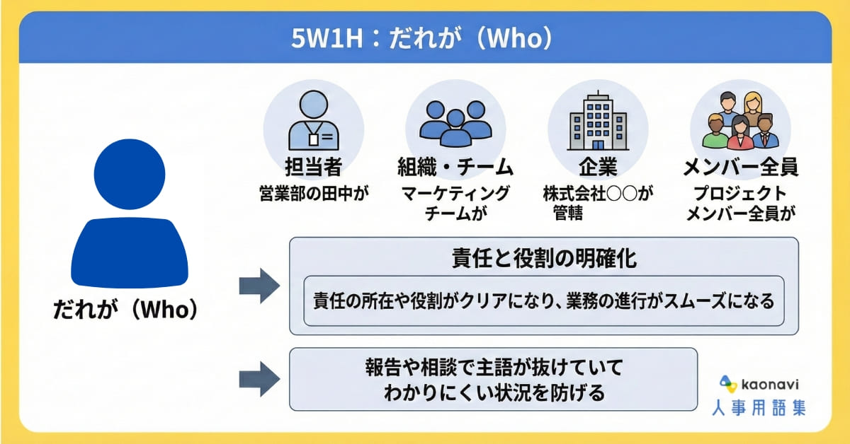 「Who」は、行動の主体となる人物、組織、担当者などを指します。