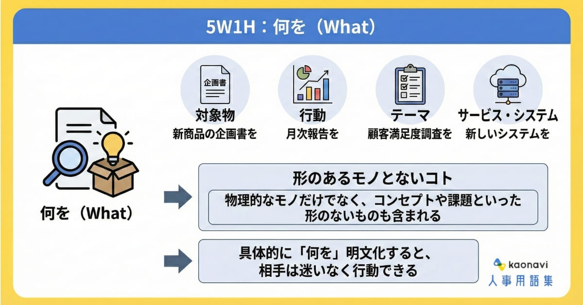 「What」は、対象物、行動、テーマ、サービスなど、物事の中心となる要素です。