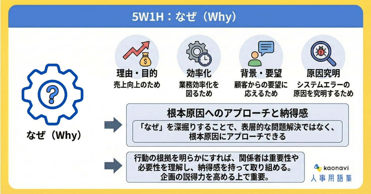 「Why」は、理由、目的、原因、背景などを示す要素です。