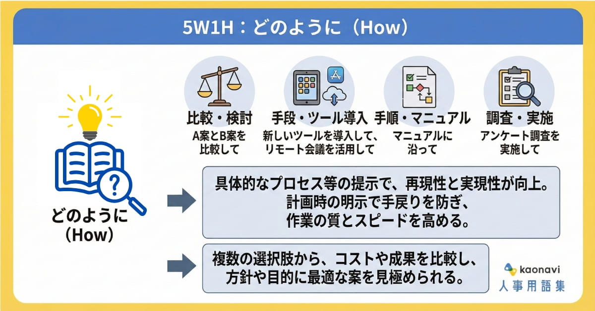 実施プロセスや技術、体制などを具体的に伝えることで、行動の再現性と実現性がぐっと高まります。計画を策定する際には「どのように」を明示できると、迷いや手戻りを防ぎ、作業の質とスピードの向上につながるでしょう。