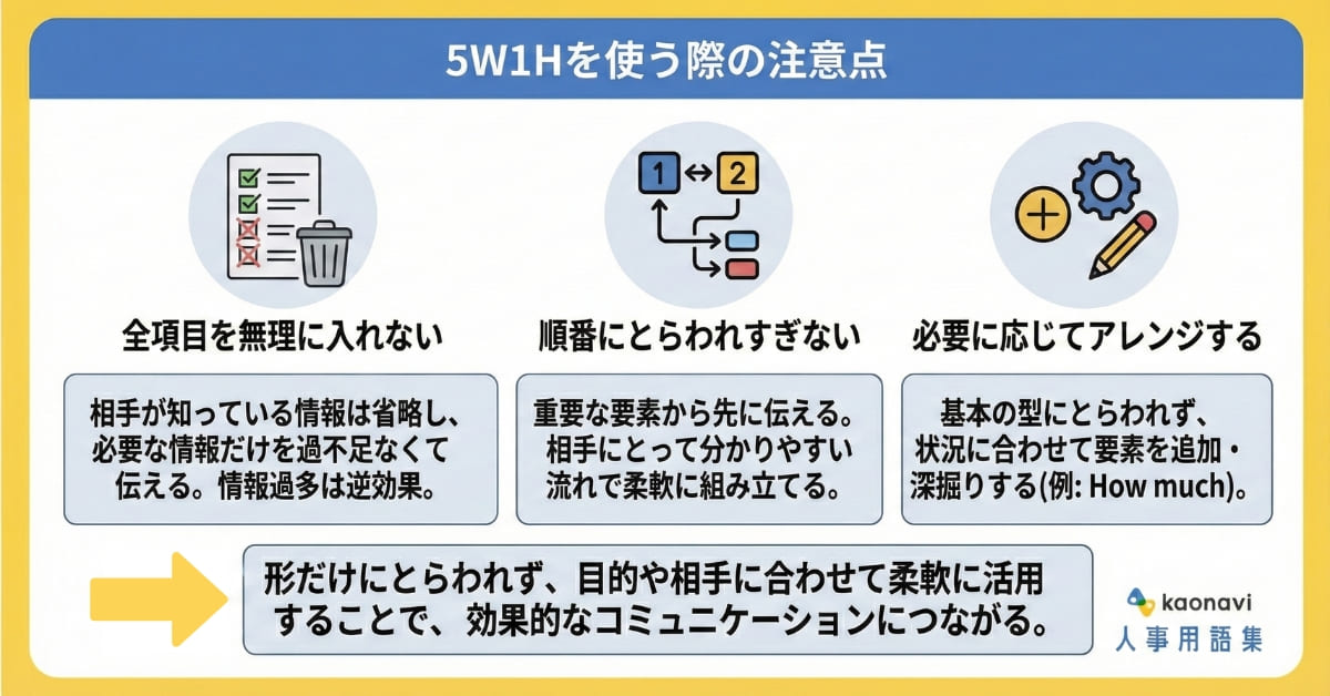 5W1Hは便利なフレームワークですが、形だけにとらわれすぎると説明が冗長になったり、柔軟な発想が妨げられたりする可能性も否めません。ここでは、5W1Hを効果的に使うための3つの注意点を紹介します。