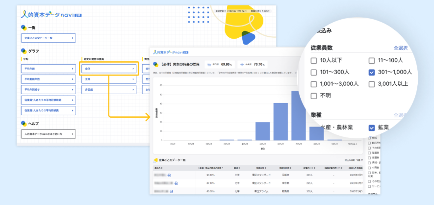 カオナビの「人的資本データnavi β版」では、上場企業の人的資本に関する開示情報を一覧で確認可能です。他社の事例を参考にしながら、自社の戦略立案や改善のヒントとしてご活用ください。