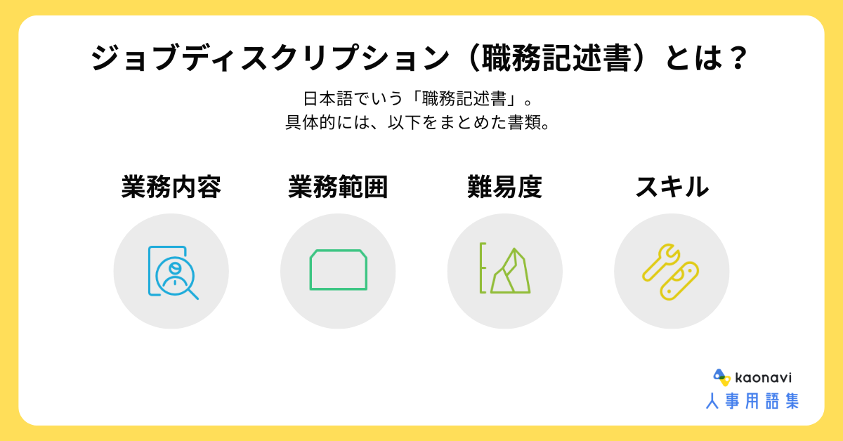 ジョブディスクリプションとは、日本語でいう「職務記述書」のこと。担当する業務内容や範囲、難易度、必要なスキルなどがまとめられた書類で、欧米では求職時や人事評価の際によく使用されています。