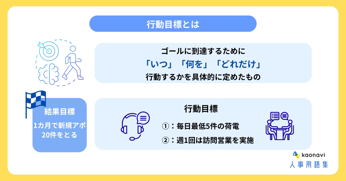 行動目標は、目標達成のために「いつ」「何を」「どれだけ」行動するかを具体的に定めたものです。