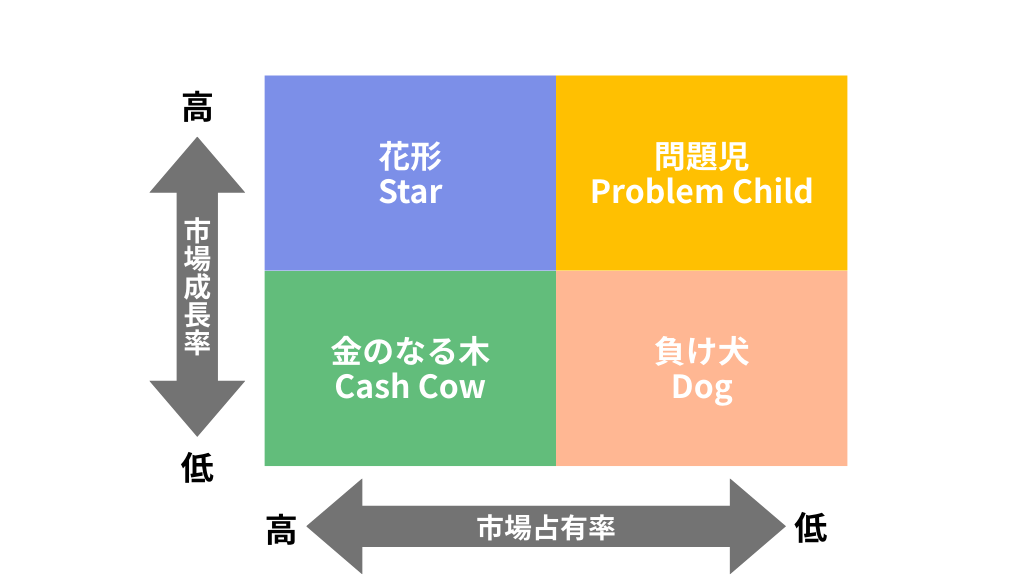 プロダクトポートフォリオマネジメントは、複数の製品や事業を「市場成長率」と「相対的市場シェア」の2軸で4つのカテゴリー(花形、問題児、金のなる木、負け犬)に分類し、資源配分や戦略を最適化するフレームワークです。