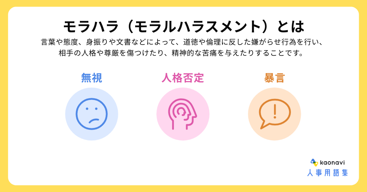 モラハラ(モラルハラスメント)とは、言葉や態度、身振りや文書などによって、道徳や倫理に反した嫌がらせ行為を行い、相手の人格や尊厳を傷つけたり、精神的な苦痛を与えたりすることです。