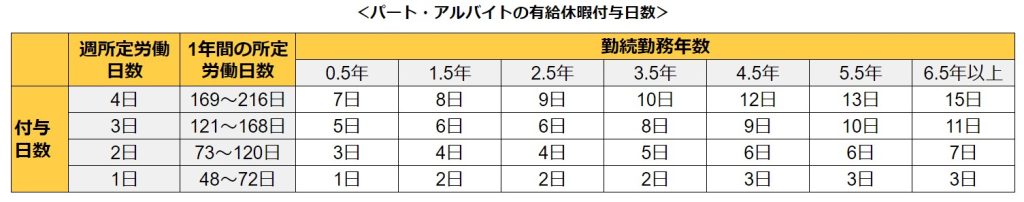 一方、「週所定労働時間が30時間未満、週所定労働日数が4日以下、または年間216日以下で出勤しているパート・アルバイト」は、1週間または1年間の所定労働日数に応じて年次有給休暇の日数が細かく分かれるので、注意が必要です。