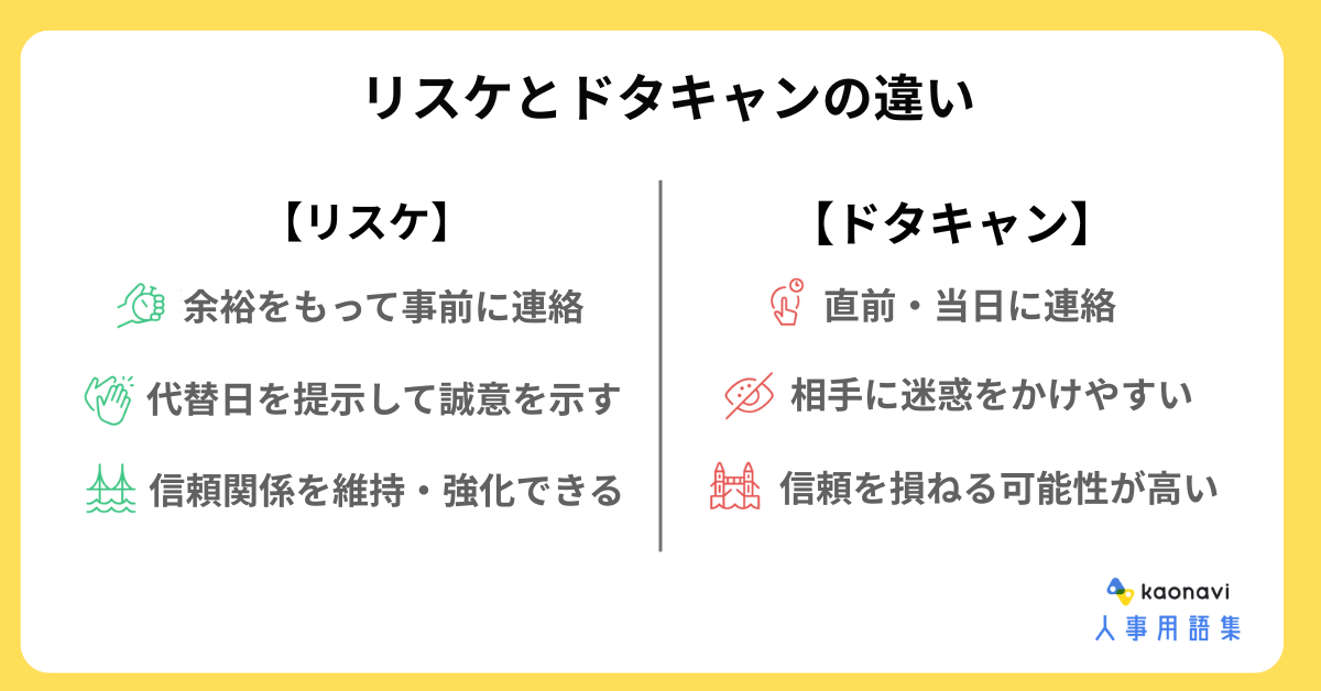 ドタキャンは直前に予定を取り消す行為で、相手に迷惑をかけるケースが多いですが、リスケはむしろ誠意を示す機会にもなります。