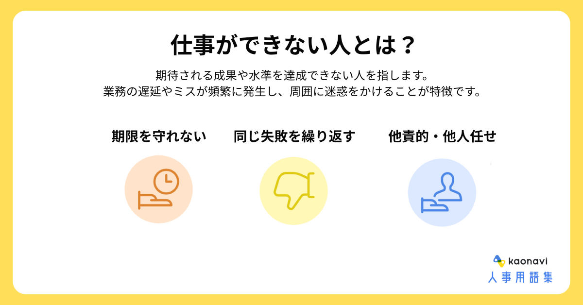 たとえば、期限を守れない・同じ失敗を繰り返す・他の人に頼らないと仕事ができないなど、業務に支障をきたす状態の従業員です。