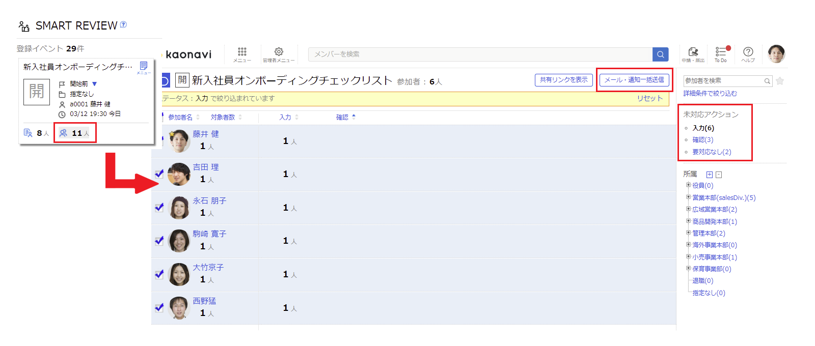 参加者一覧の画面で「メール・通知一括送信」の機能を使うと、未対応のアクションで絞り込んで対象者へメールの一括送信も可能。指定したアクション以外の人は除外され通知も届かないため、入社日の異なる社員がいても、1つのイベントで管理することができます。