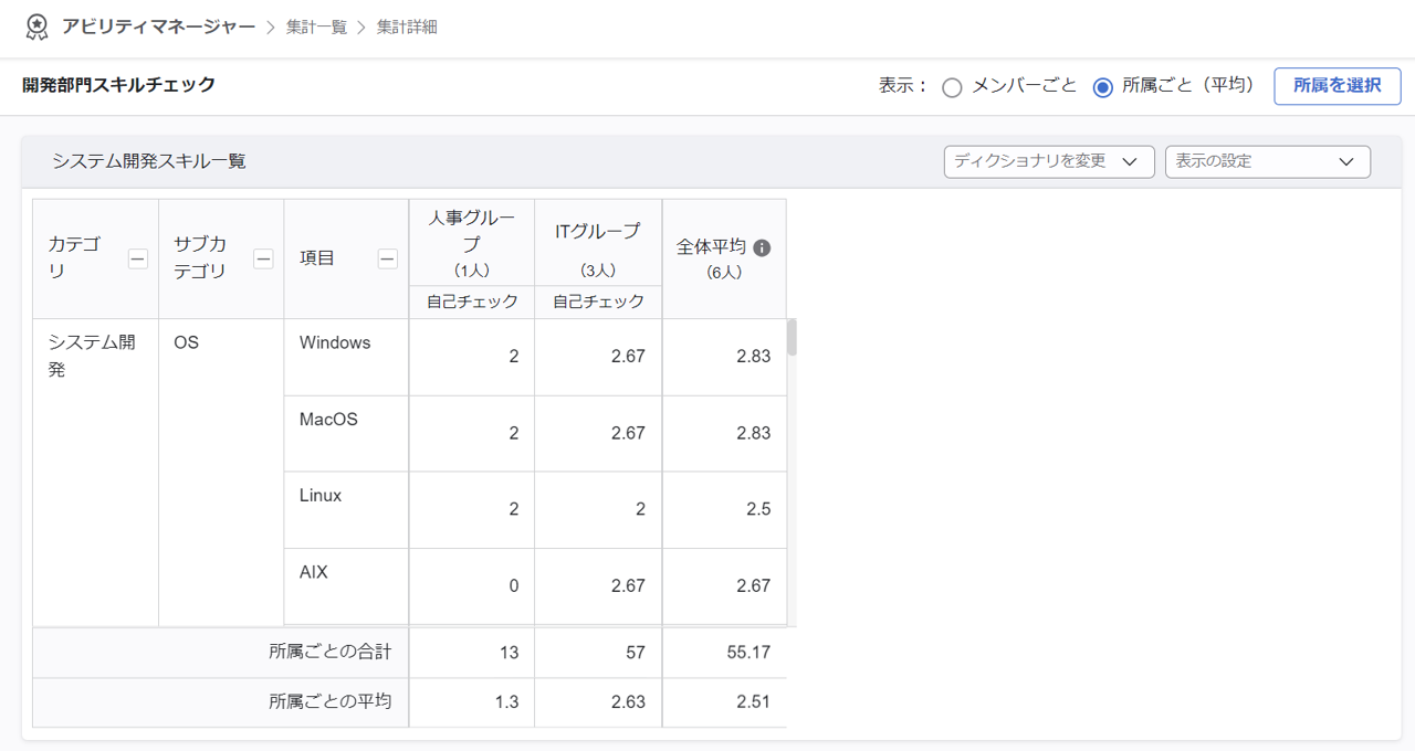 また、メンバーごとだけではなく、所属ごとの平均も比較することができます。組織的な育成状況が可視化されたことで、現場・人事問わず次の打ち手の検討に役立っています。