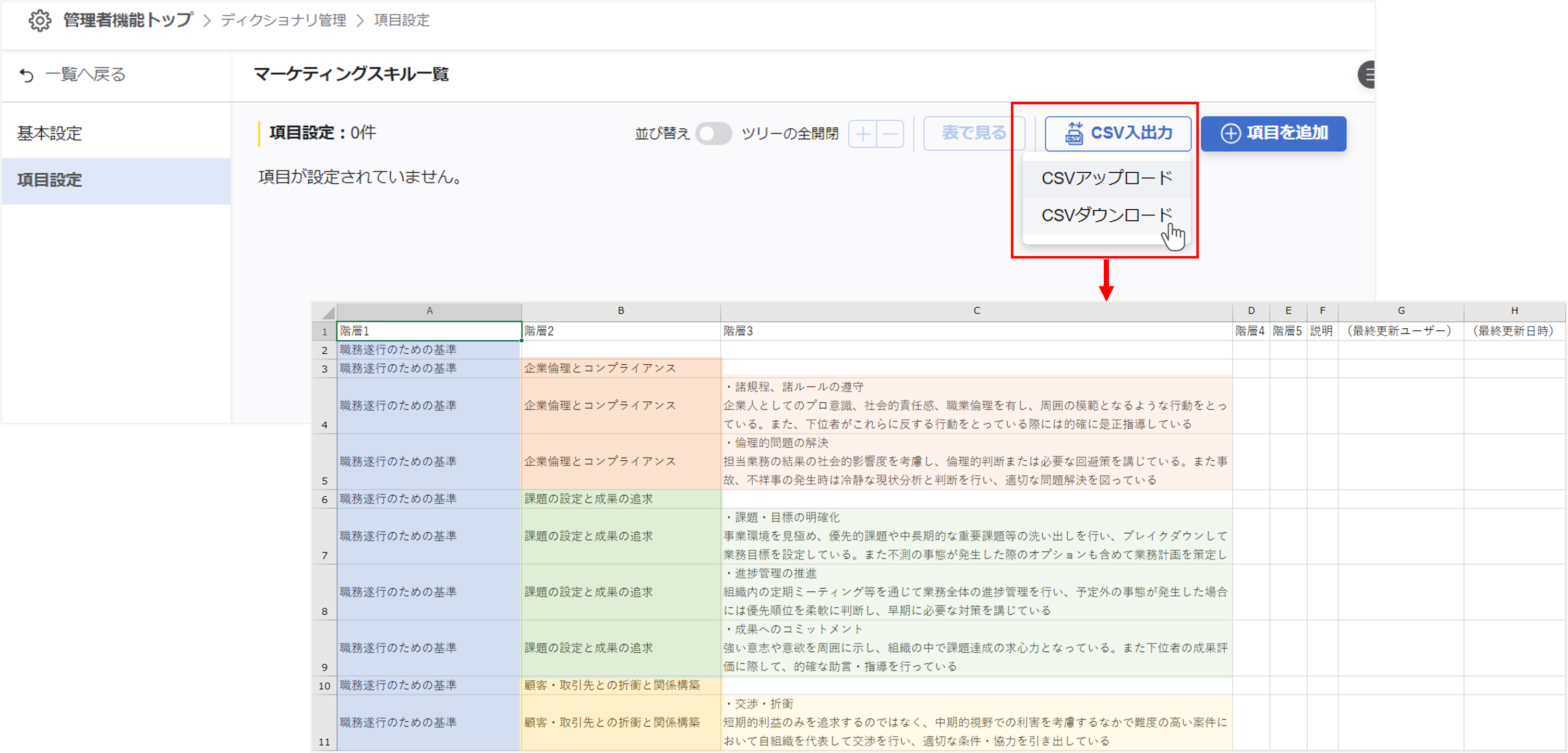 スキル項目は階層構造を用いたデータとして設定可能で、項目編集や階層の追加も柔軟に行えます。スキル定義がされていない職種では現場部門と相談しつつ項目を調整し、定義済みの職種については既存のスキルシートをCSVデータで登録しました。