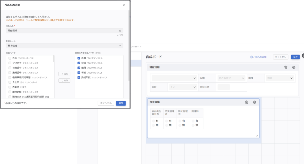 シートを検索して項目をボード上に追加できるので、先ほどデータ連携で作成したシートも必要な項目だけを追加します。