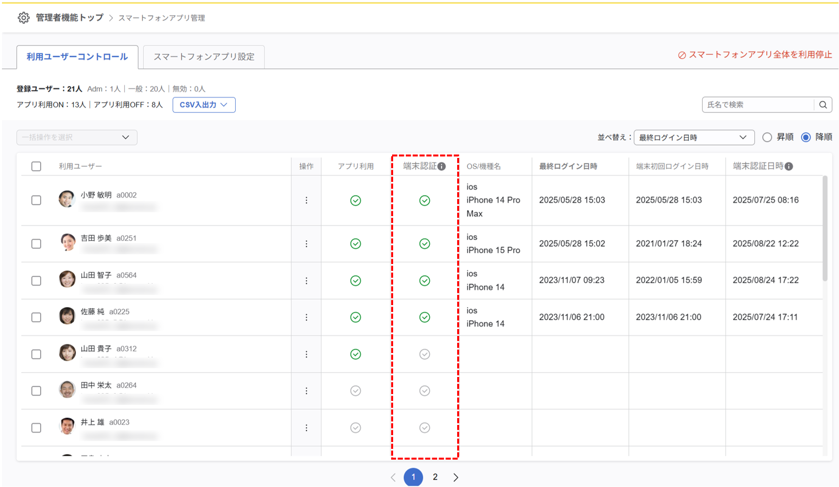 ■管理者機能>スマートフォンアプリ管理>利用ユーザーコントロール画面