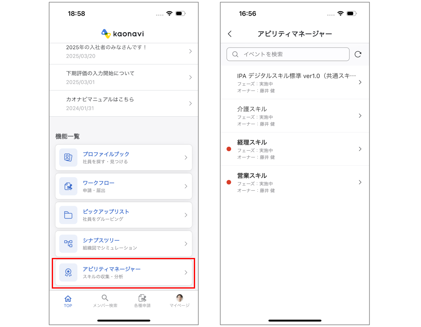 スキル管理(アビリティマネージャー)がカオナビアプリでも利用できることで、パソコンがない環境でもスキル管理ができるようになります。