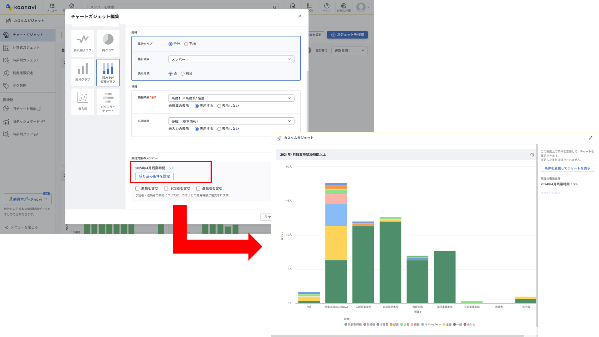 社員データグラフ(カスタムガジェット)において、複数レコードのサマリー情報で絞り込みができるようになりました