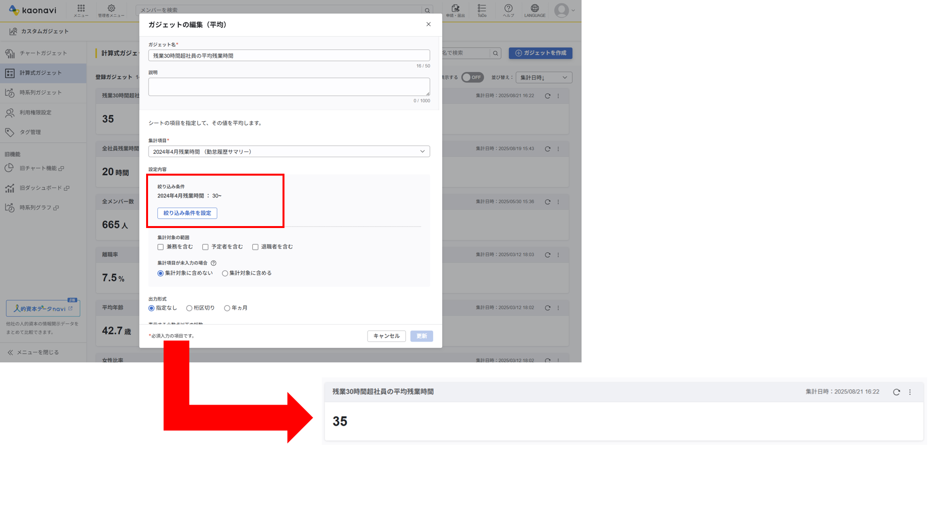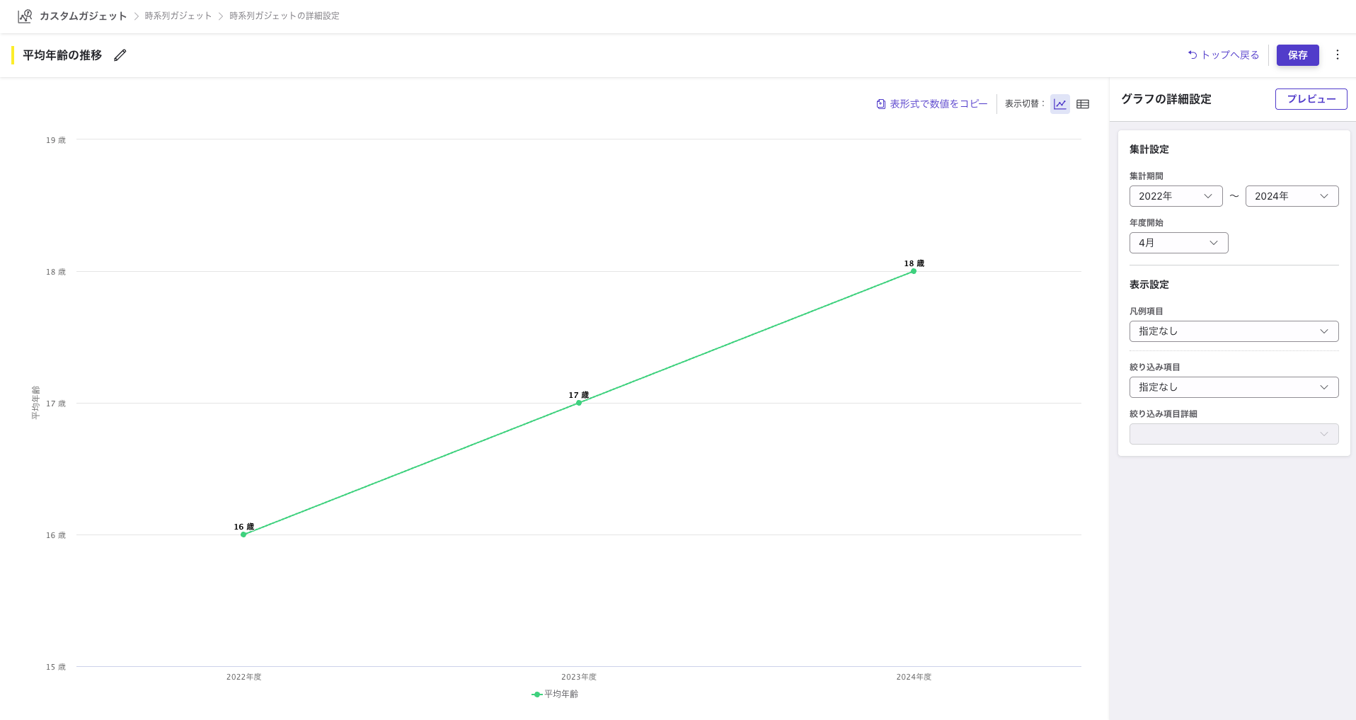 社員データグラフ(カスタムガジェット)の「時系列ガジェット」で、あらたに「平均年齢の推移」のグラフがガジェットとして保存できるようになりました。