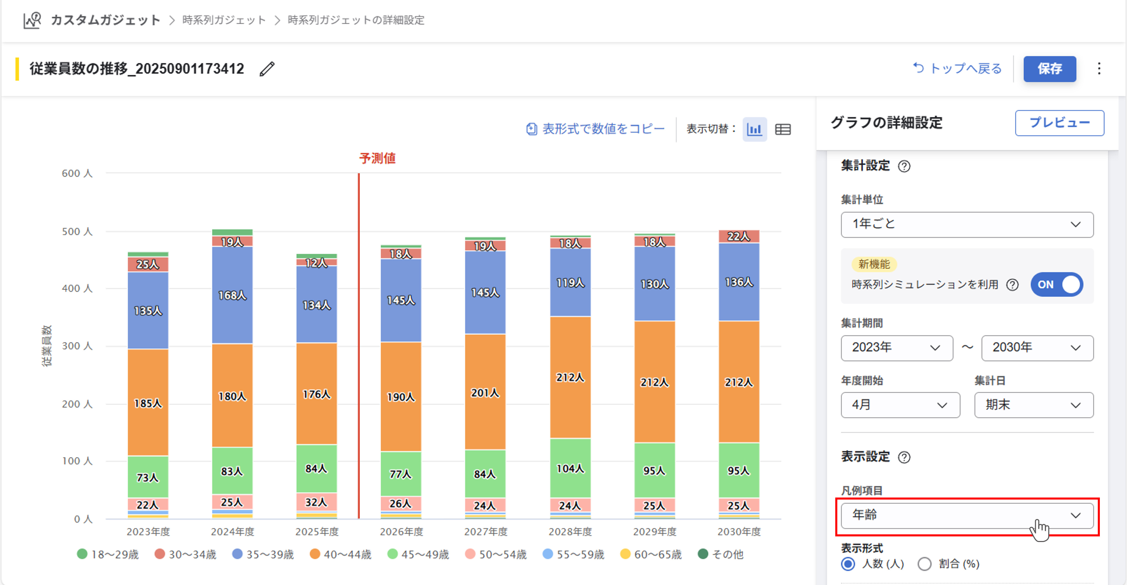社員データグラフ(カスタムガジェット)内、時系列ガジェットの『従業員数の推移グラフ>時系列シミュレーション』で、凡例項目に「年齢」を指定できるようになりました。