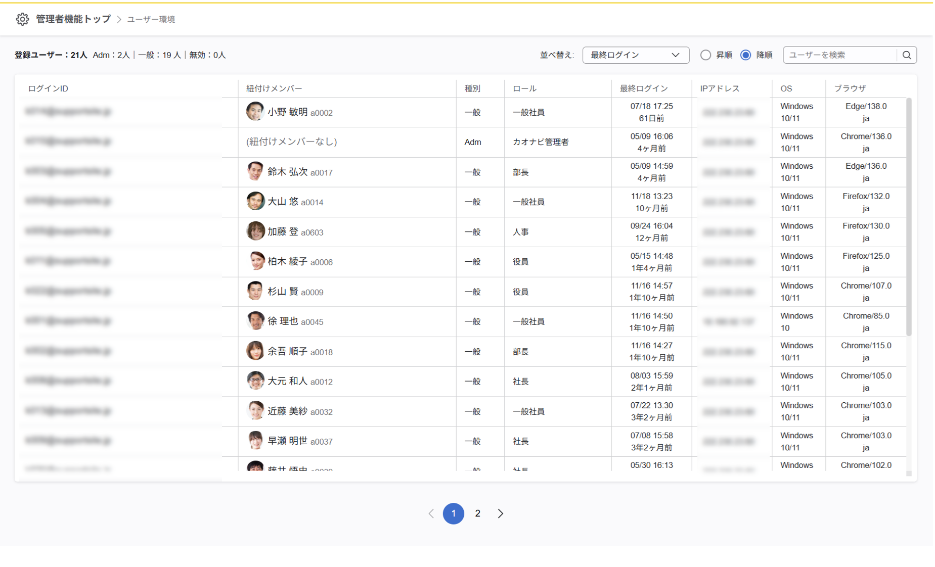 ログインID、紐づけメンバー、種別、ロール、最終ログイン、IPアドレス、OS、ブラウザを表形式で表示し、他の画面とデザインを揃え、より直感的に操作いただけるように改善しました。
