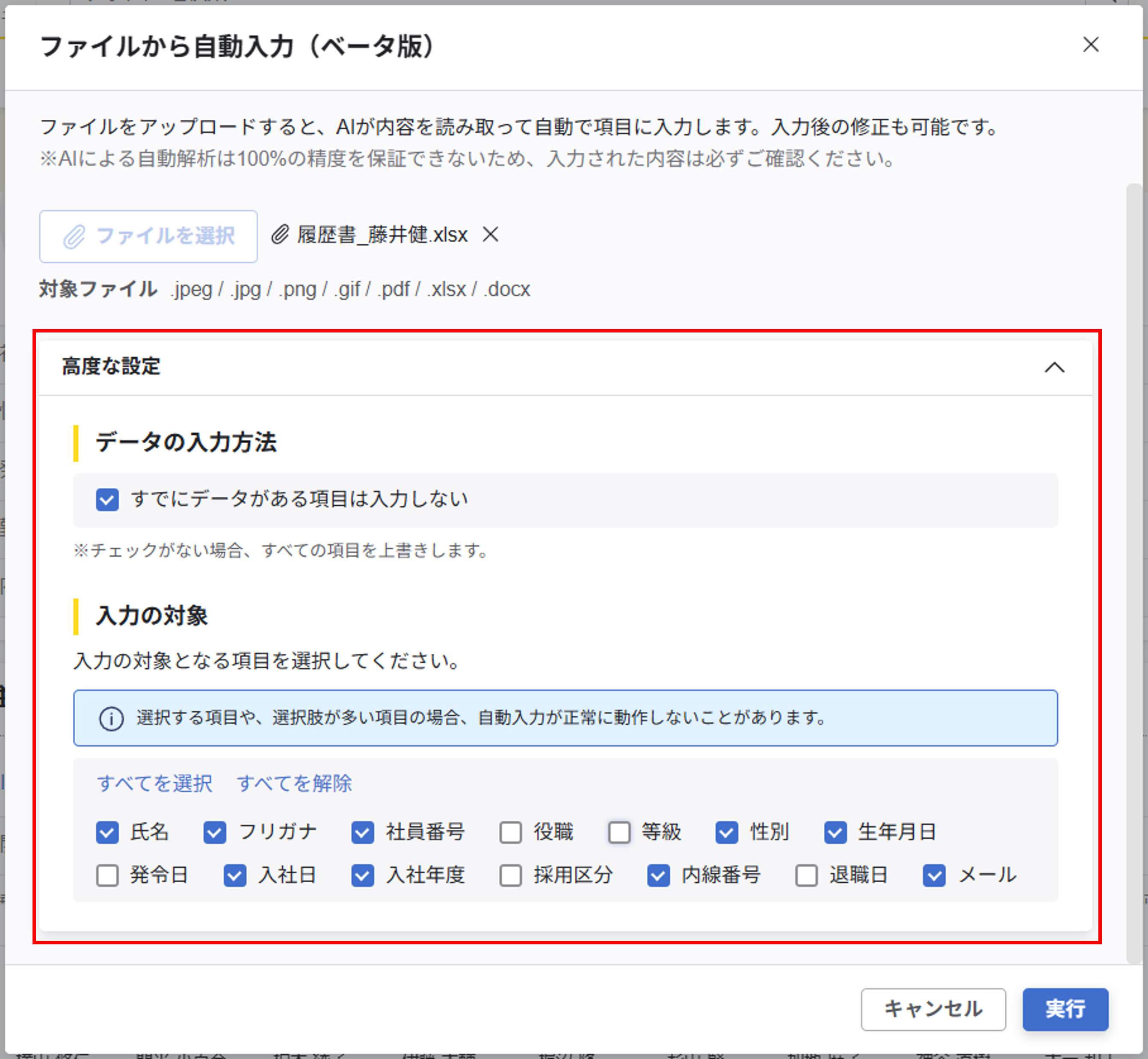 人材データベース(プロファイルブック)の「ファイルから自動入力」機能にて自動入力対象の項目が選択できるようになりました。