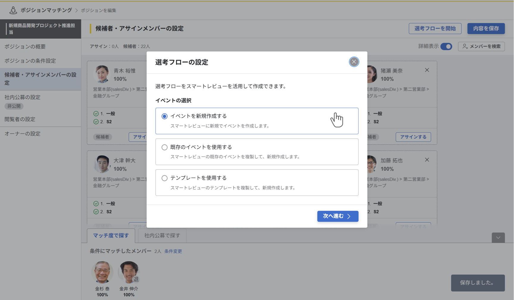 『選考フローを開始』することで、ポジションに設定された候補者が自動で対象者として設定されたスマートレビューのイベントを作成することが出来ます。
