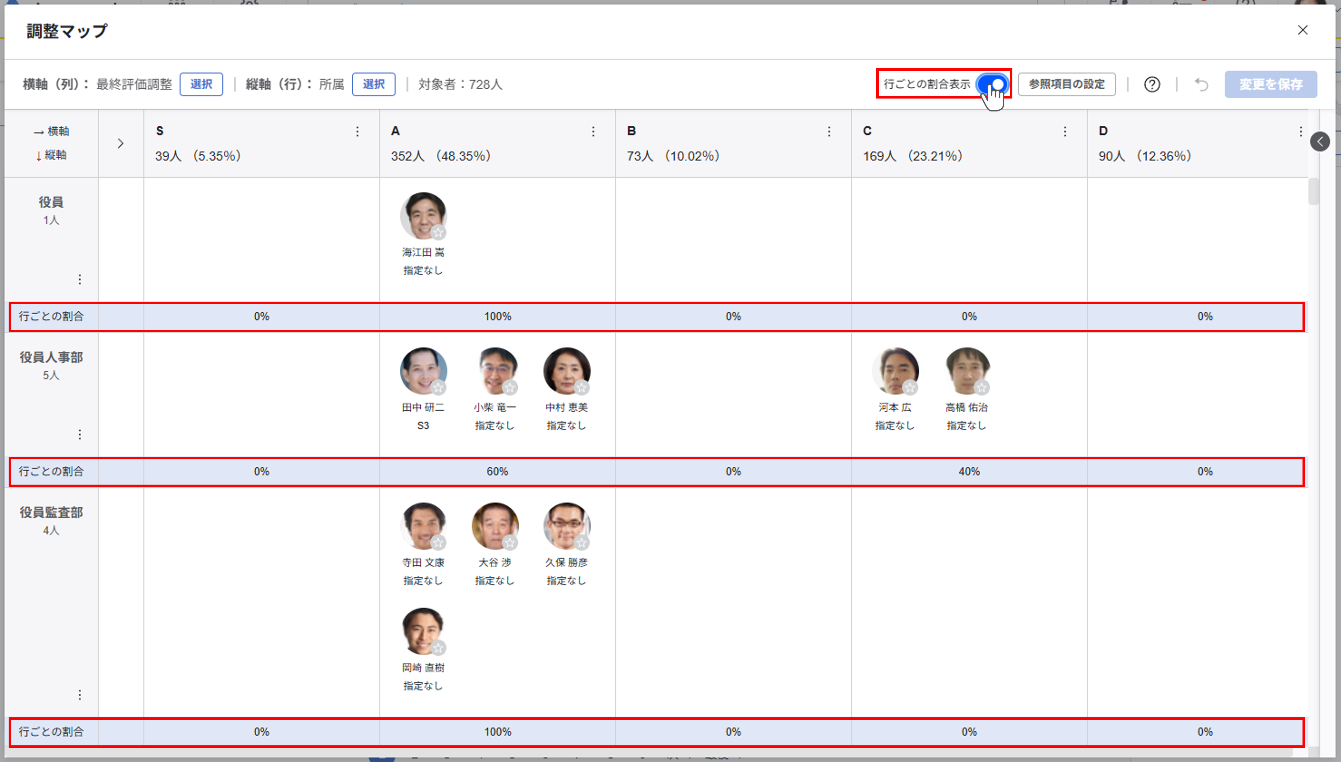 評価ワークフロー(スマートレビュー)の調整マップ2軸表示の際に縦軸ごとに割合が表示できるようになりました