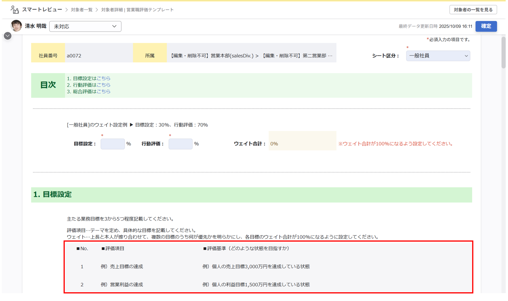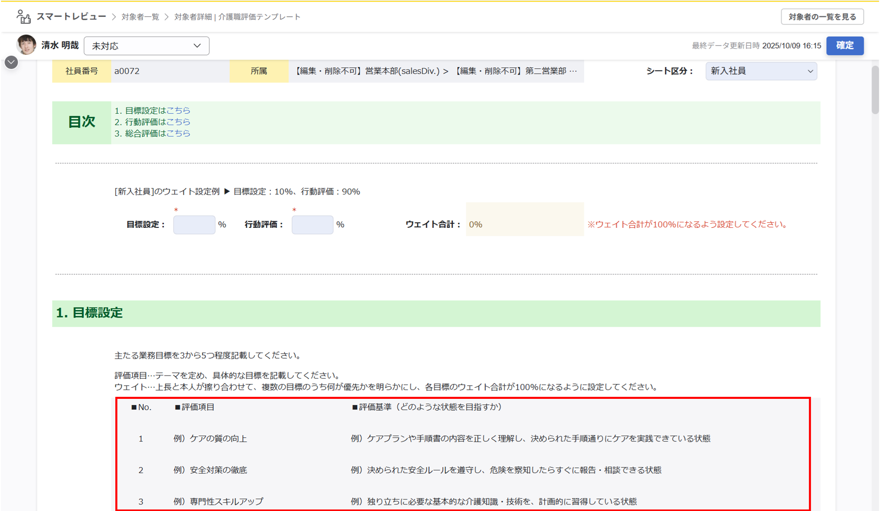 従業員の等級や職能などに応じて目標値(下限・上限値)を出し分けることができ、回答がしやすくなります。