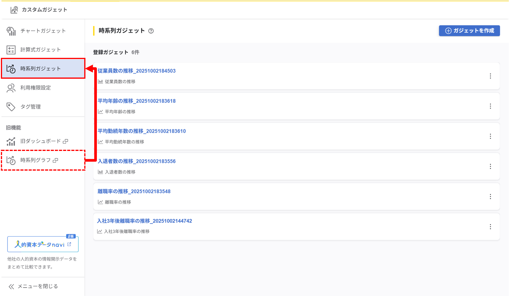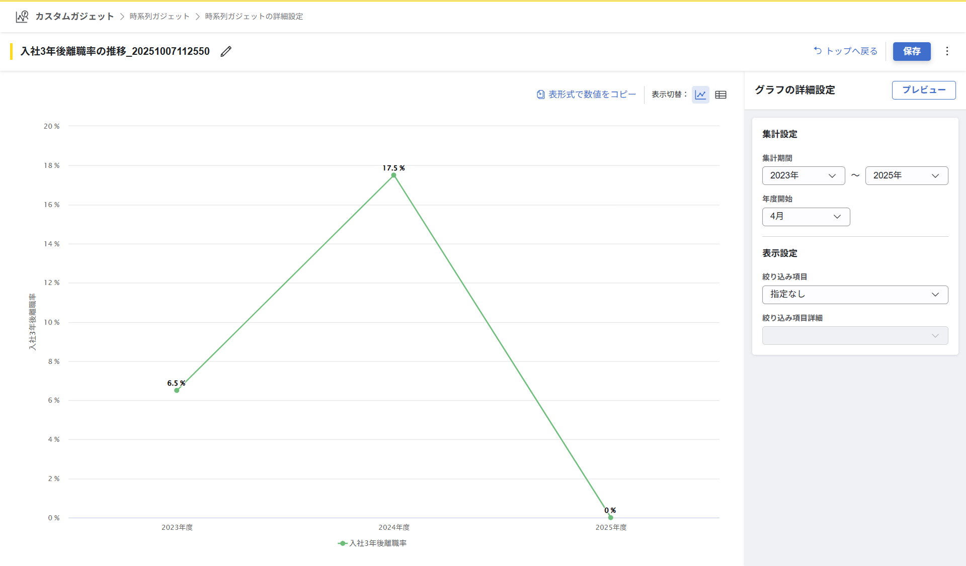 社員データグラフ(カスタムガジェット)の「時系列ガジェット」で、あらたに「入社3年後離職率の推移」のグラフがガジェットとして保存できるようになりました。