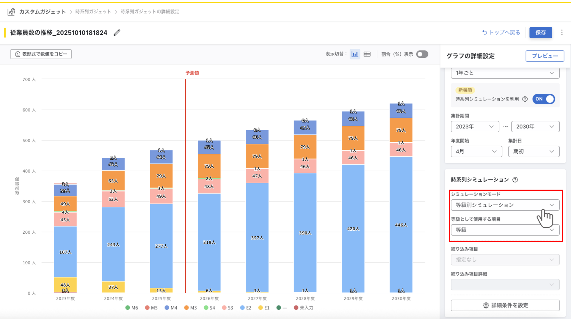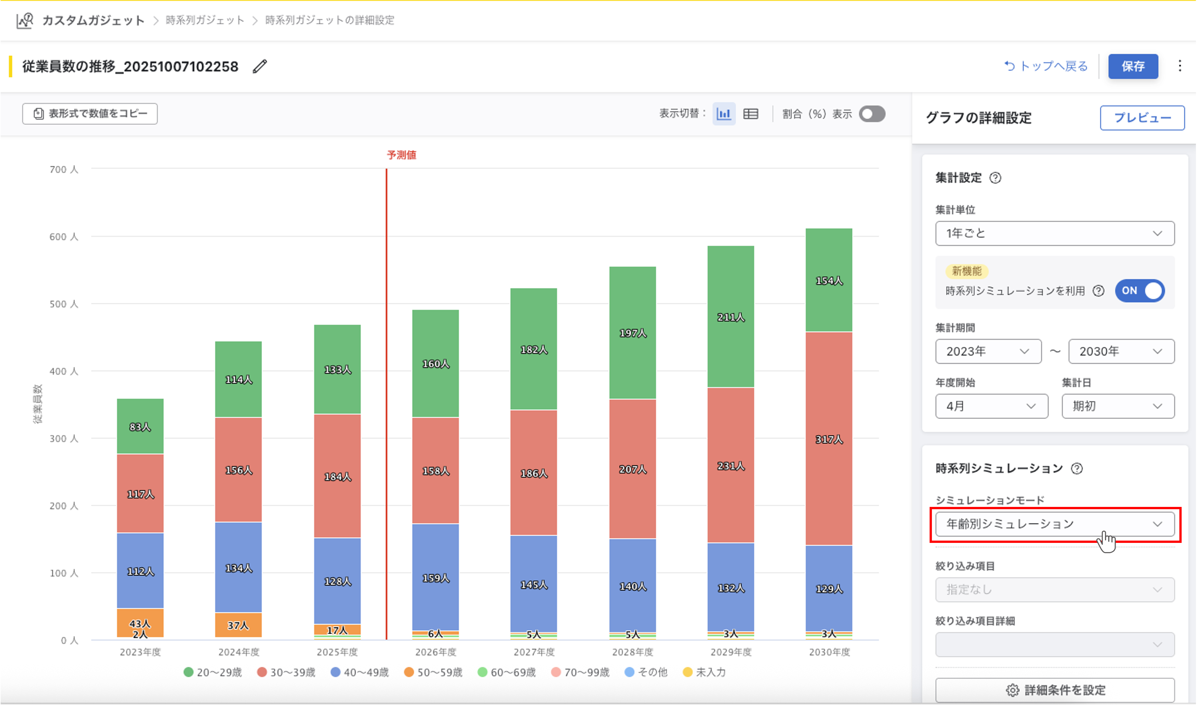 性別、年齢、役職、等級ごとに従業員数の推移を予測してグラフを表示できます。
