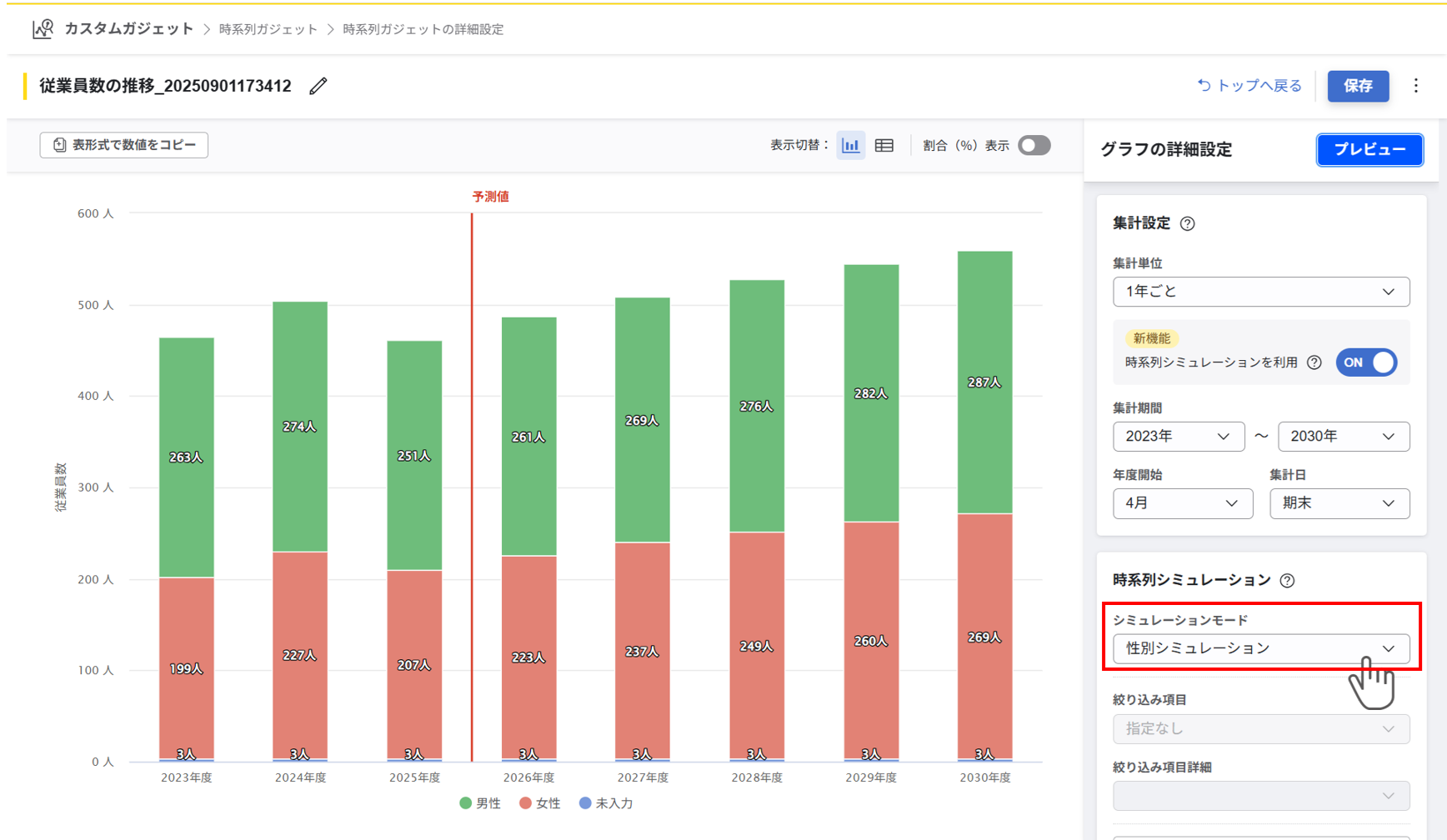 社員データグラフ(カスタムガジェット)内、時系列ガジェットの『従業員数の推移グラフ>時系列シミュレーション』で、4種類のシミュレーションモードを設定できるようになりました。