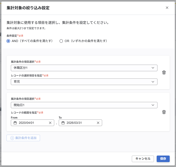これにより、「20XX年度で1ヶ月の残業時間が45時間を超えた月の数を数える」や、「特定の期間で育児休暇を取得した回数を数える」などの使い道で集計対象を絞り込めます。