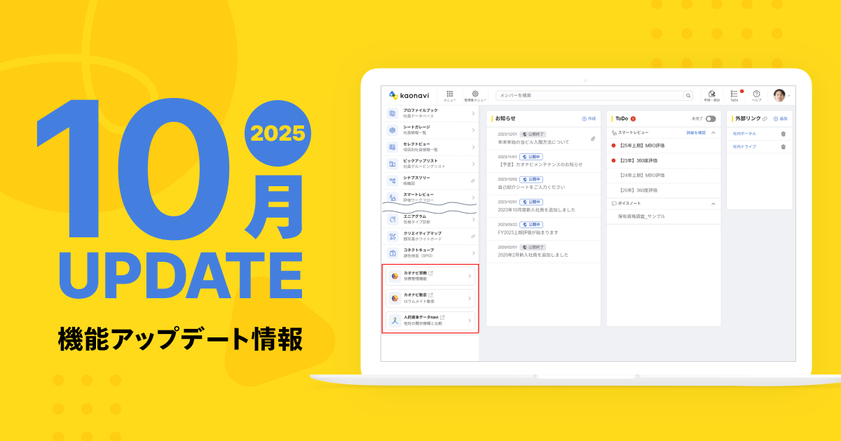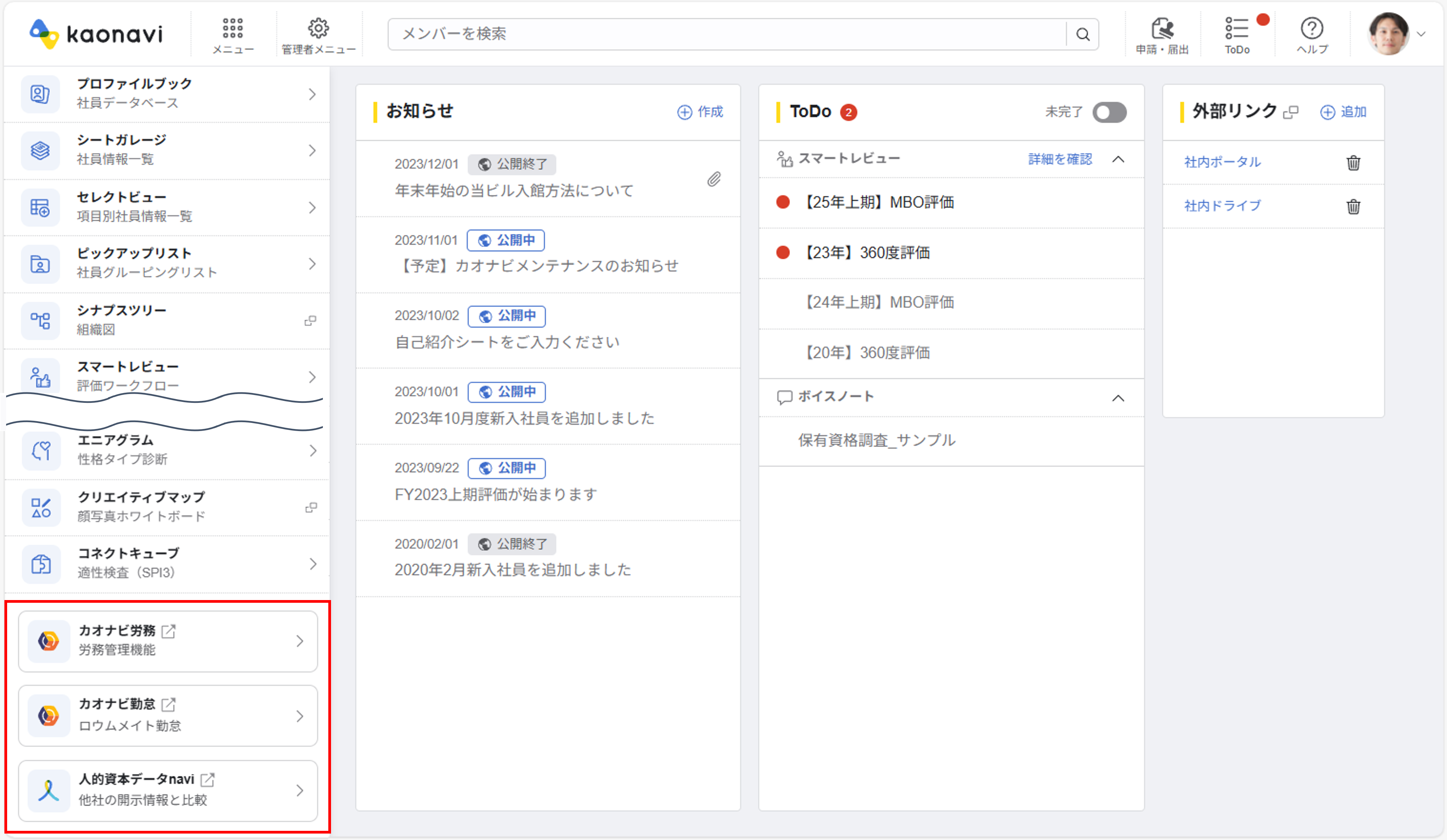 これまで「カオナビ労務」「人的資本データnavi」はバナーリンクより遷移いただけましたが、あらたに「カオナビ勤怠」とあわせ画面左側の「サイドメニュー」および画面上部の「グローバルナビゲーションメニュー」より遷移いただけます。