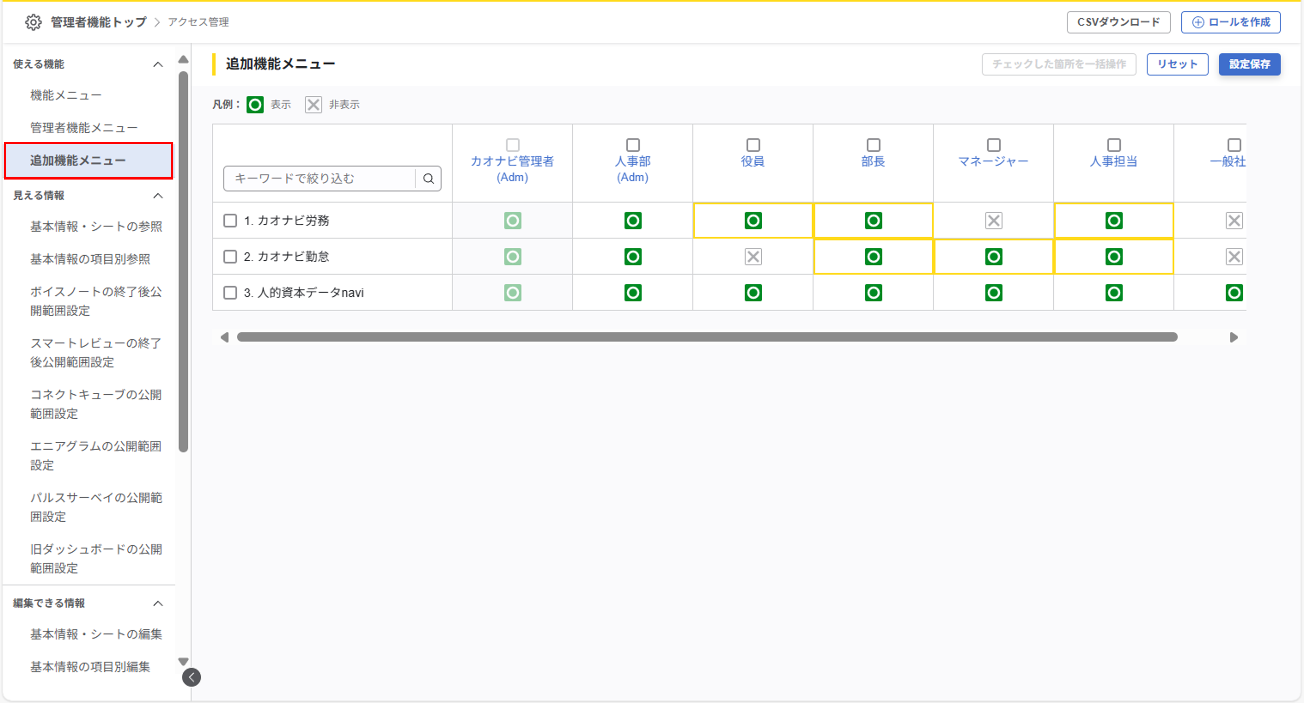 ※これまで『アクセス管理>その他の設定>付属機能』にて設定いただいた「カオナビ労務」へのログイン権限については、『使える機能>追加機能メニュー』に集約されます。