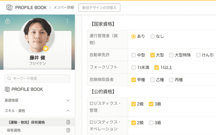 顔と名前、役職、勤続年数などの基本情報はもちろん、異動・研修の履歴、所有資格、若手社員の面談記録など様々な情報を登録。
