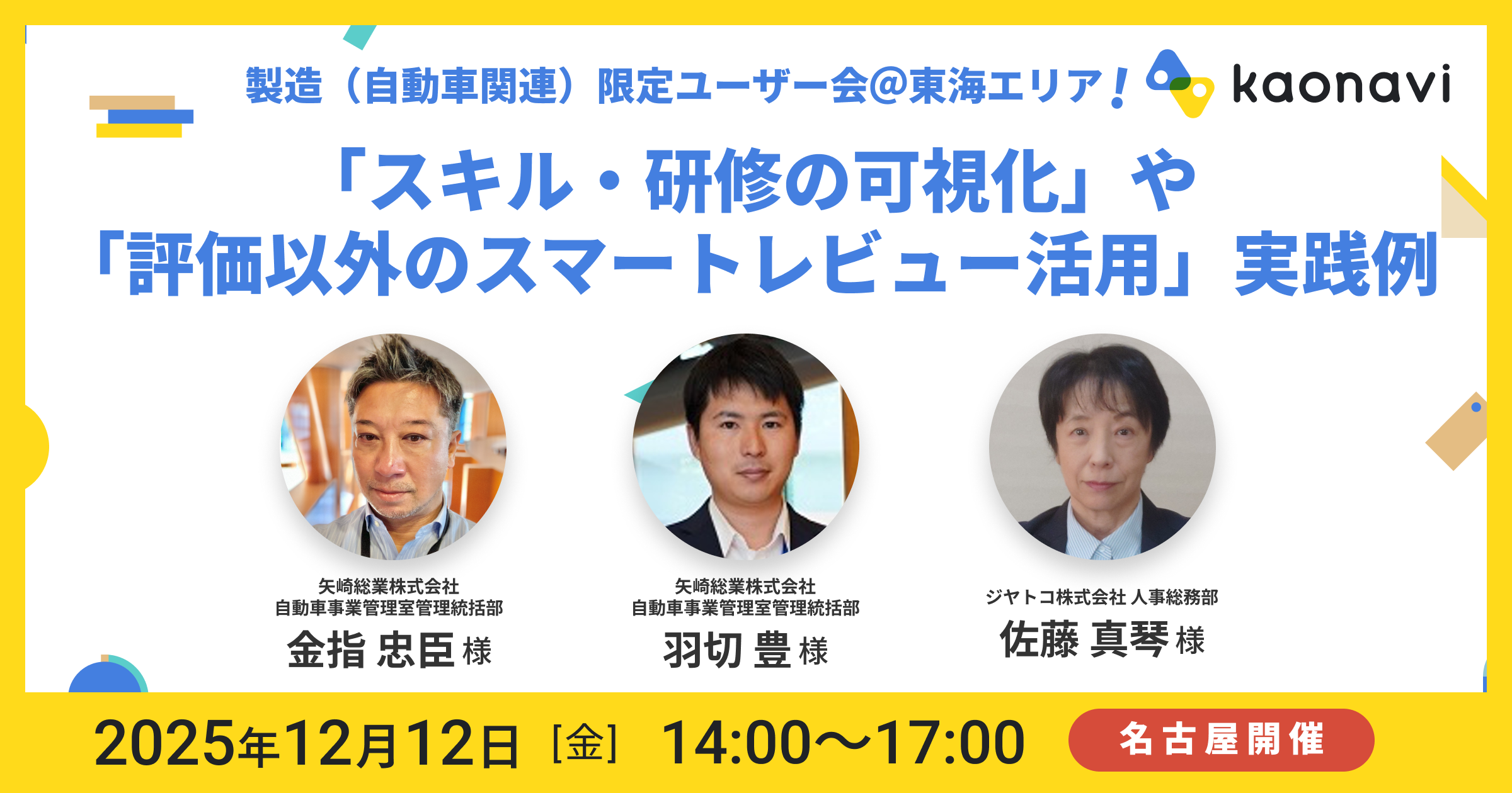 本セミナーは、同じ自動車関連業界の矢崎総業株式会社様とジヤトコ株式会社様をお招きし、カオナビを活用した具体的な運用事例をご紹介いただく、限定のイベントです。