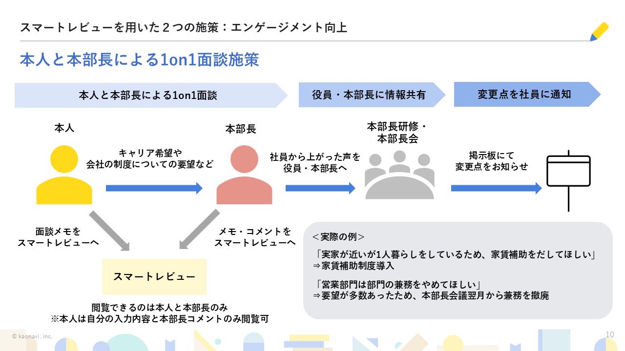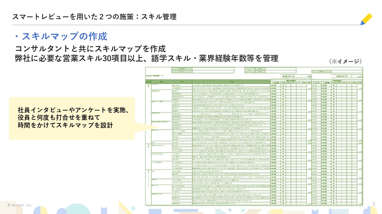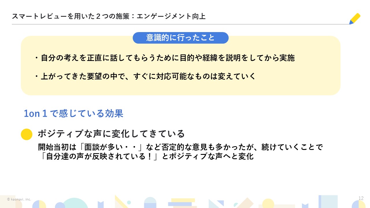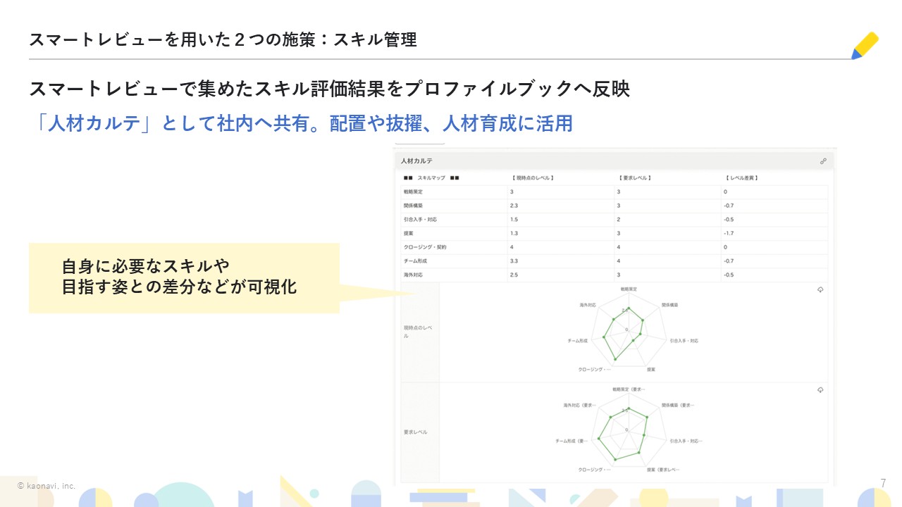 カオナビの導入以後は、スマートレビューを用いて主にスキル管理とエンゲージメント向上という2つの施策を進めてきました。