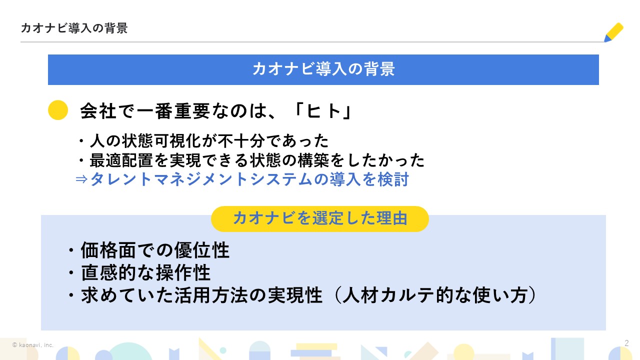 そこでタレントマネジメントシステムの導入を考えるようになり、比較検討した結果カオナビを導入することとなりました。