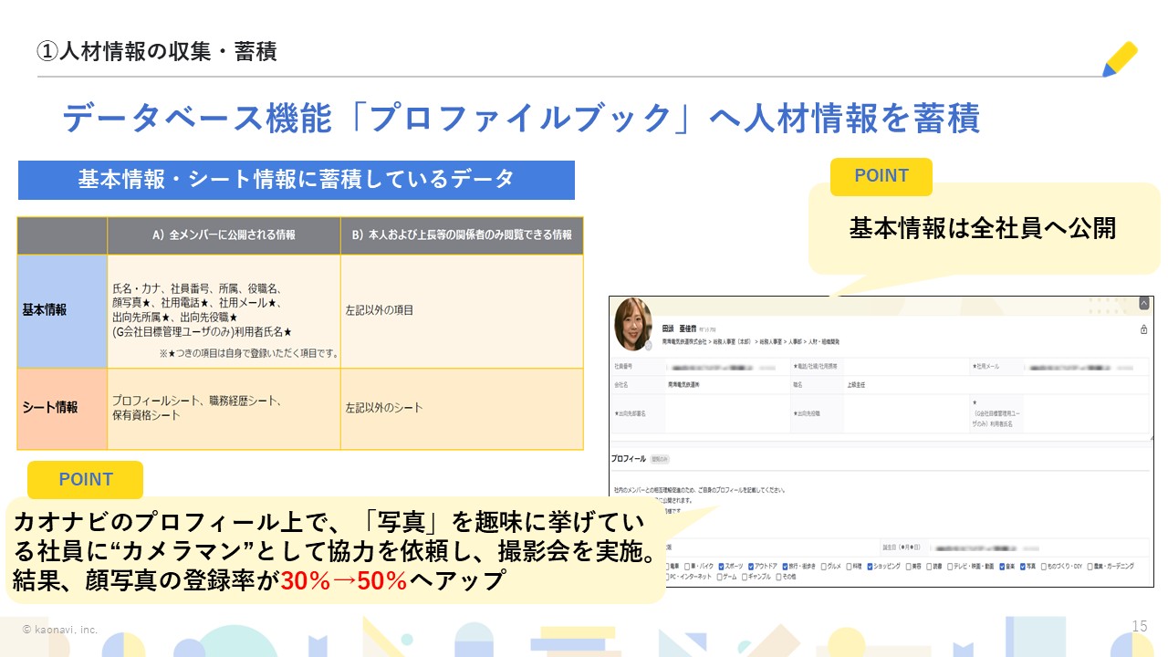 「プロファイルブック」に従業員自らの情報を入力し、さらに趣味欄に”写真”と記載している従業員の協力を得て、プロフィール写真の撮影会を開催したことで、写真の登録率もアップしました。