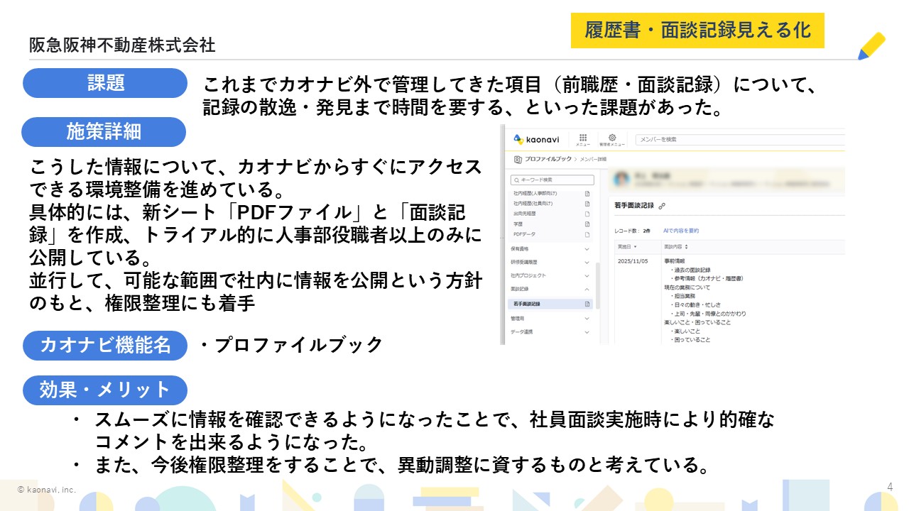当社が課題としていたのは、履歴書の管理です。履歴書はすべてを紙ベースで管理していた一方、異動や昇格の履歴は別にデータで管理していたため、非常に煩雑でした。