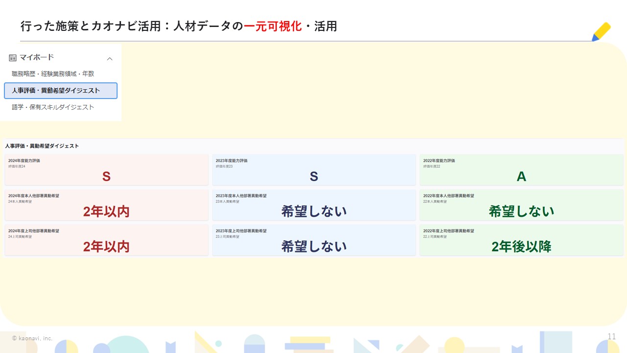 そして蓄積した情報をマイボードにて「人事評価ダイジェスト」「異動履歴」としてまとめ、ライン長や役員がいつでも簡単に見られる状態へと設計されました。