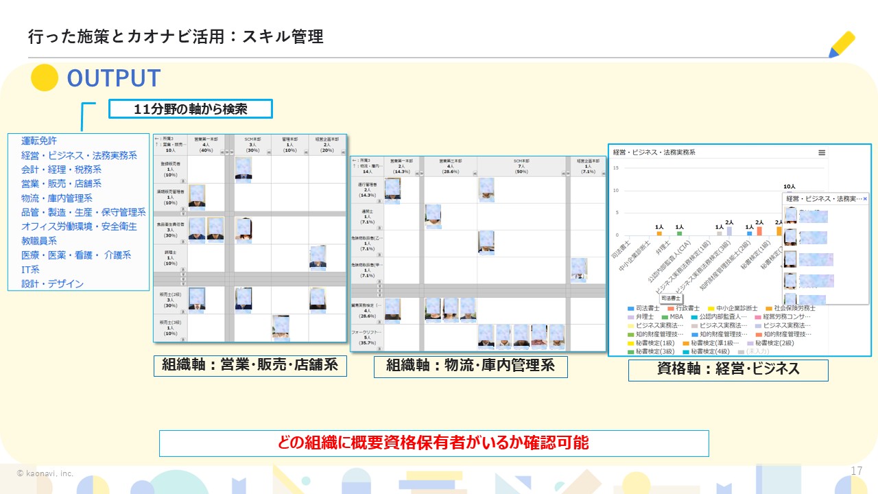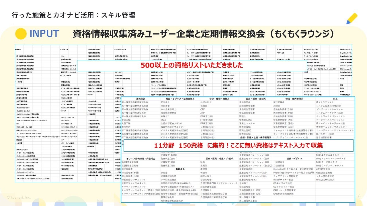 カオナビが定期的に開催している「もくもくラウンジ」(ユーザー交流会)に参加し、他社の情報を収集。先行して取り組みを進めている他社ユーザーから資格リストをもらい、その中から自社の業務に関連する11分野150資格を選定して収集を開始されました。