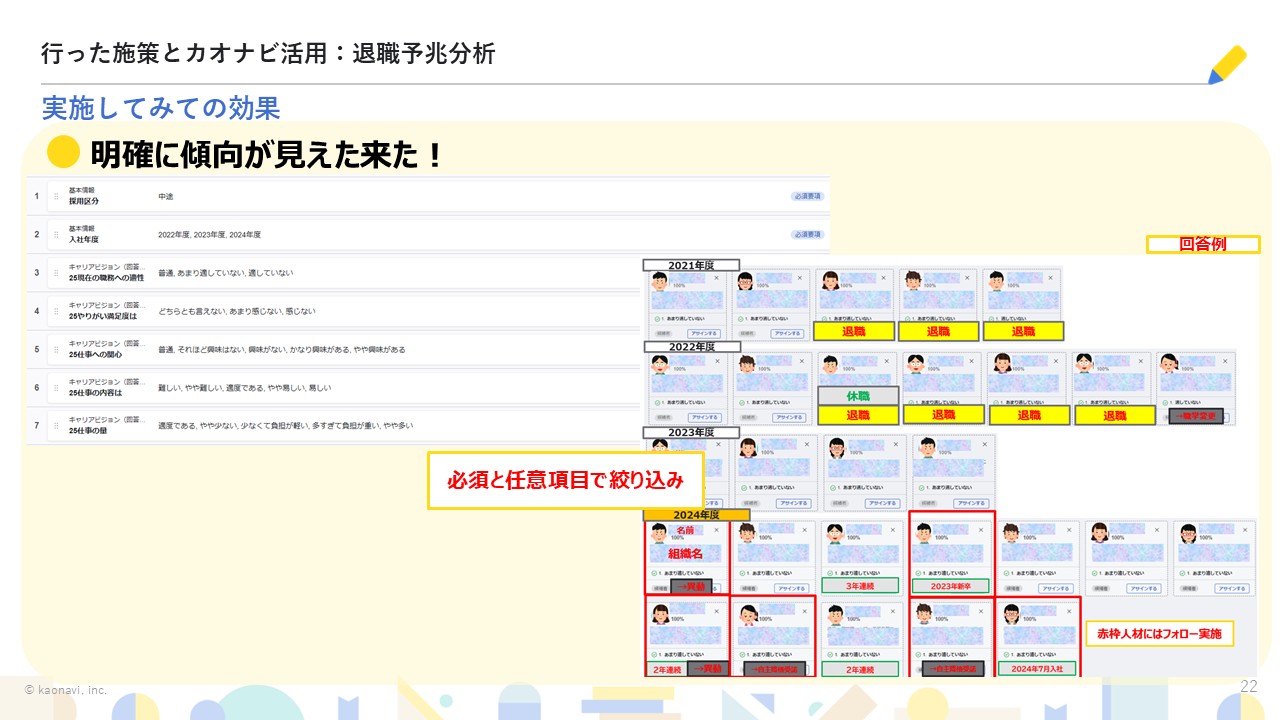 また、ポジションマッチング機能に過去のキャリア申告データを入れてみたところ、「適していない」「あまり適していない」と回答していた方の退職予兆傾向が明確に見えてきたそうです。