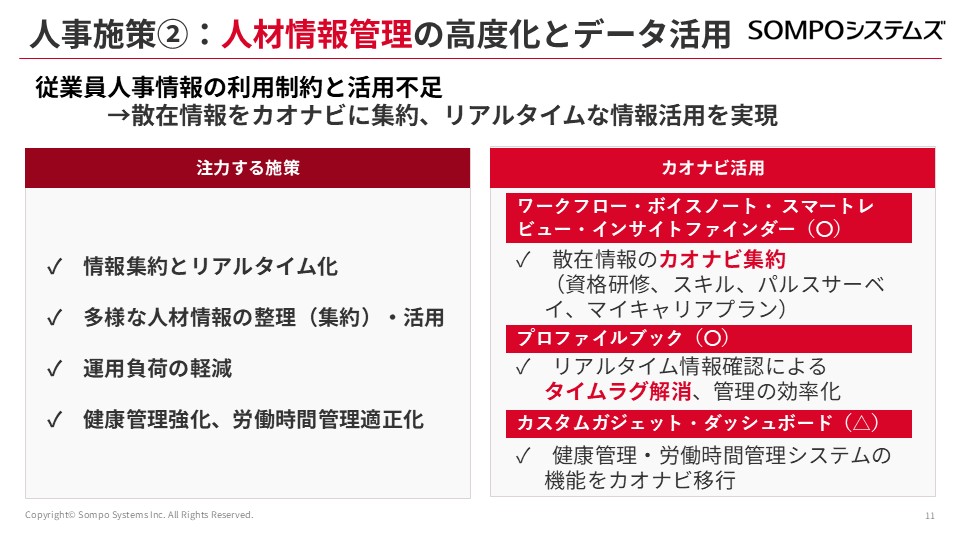 人事情報管理をより高度にするためにも、カオナビを積極活用しています。具体的には、情報集約と更新のリアルタイム化、多様な人材情報の整理・活用、運用負荷の軽減、健康管理強化、労働時間管理適正化などを目指しています。これらの実現のため、スマートレビュー、ボイスノート、ワークフロー、プロファイルブックなど複数の機能を組み合わせて活用しています。