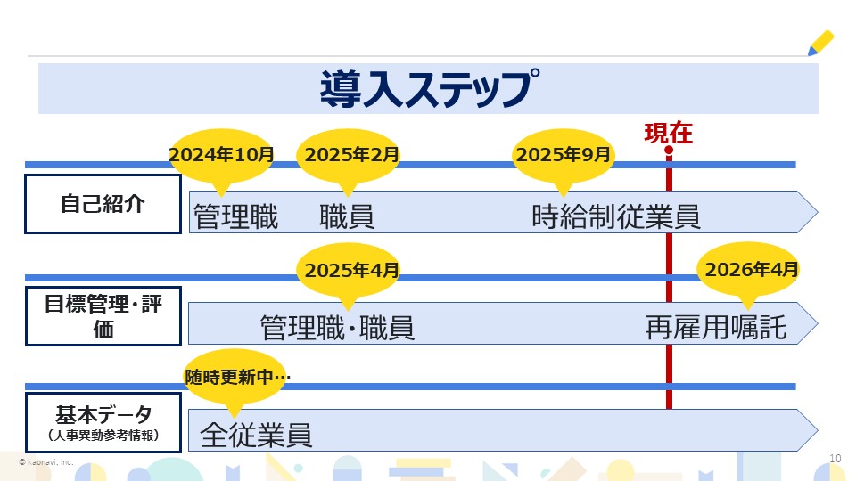 まず評価制度導入のために、最初に最低限必要な基本データを入力しました。また2024年10月には、管理職に自己紹介や顔写真を登録してもらいました。その後、職員や時給制職員にも広げていきました。