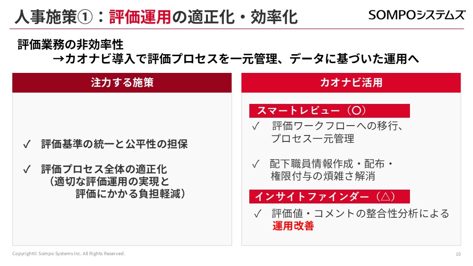 1つ目は、スマートレビューを使った評価制度運用です。これにより、権限設定における課題をすべて解決することができました。現場ユーザー側にとって使いやすいものになったと聞いています。期の途中での設定変更が可能な点にも、非常に助けられました。