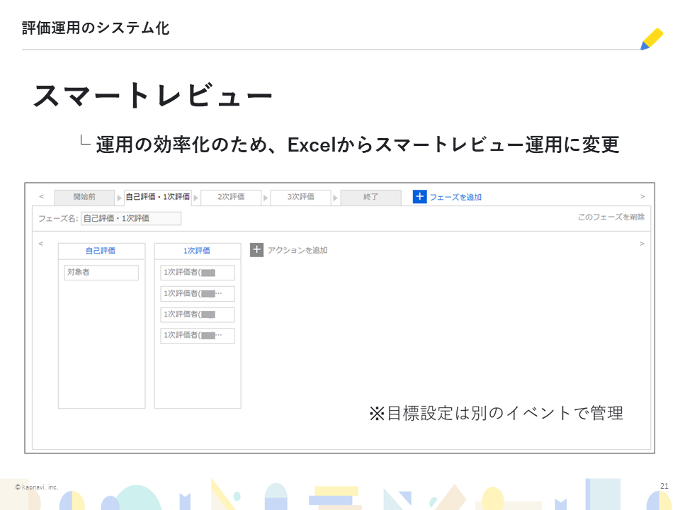まず1つ目の評価制度の運用には、スマートレビューを使っています。